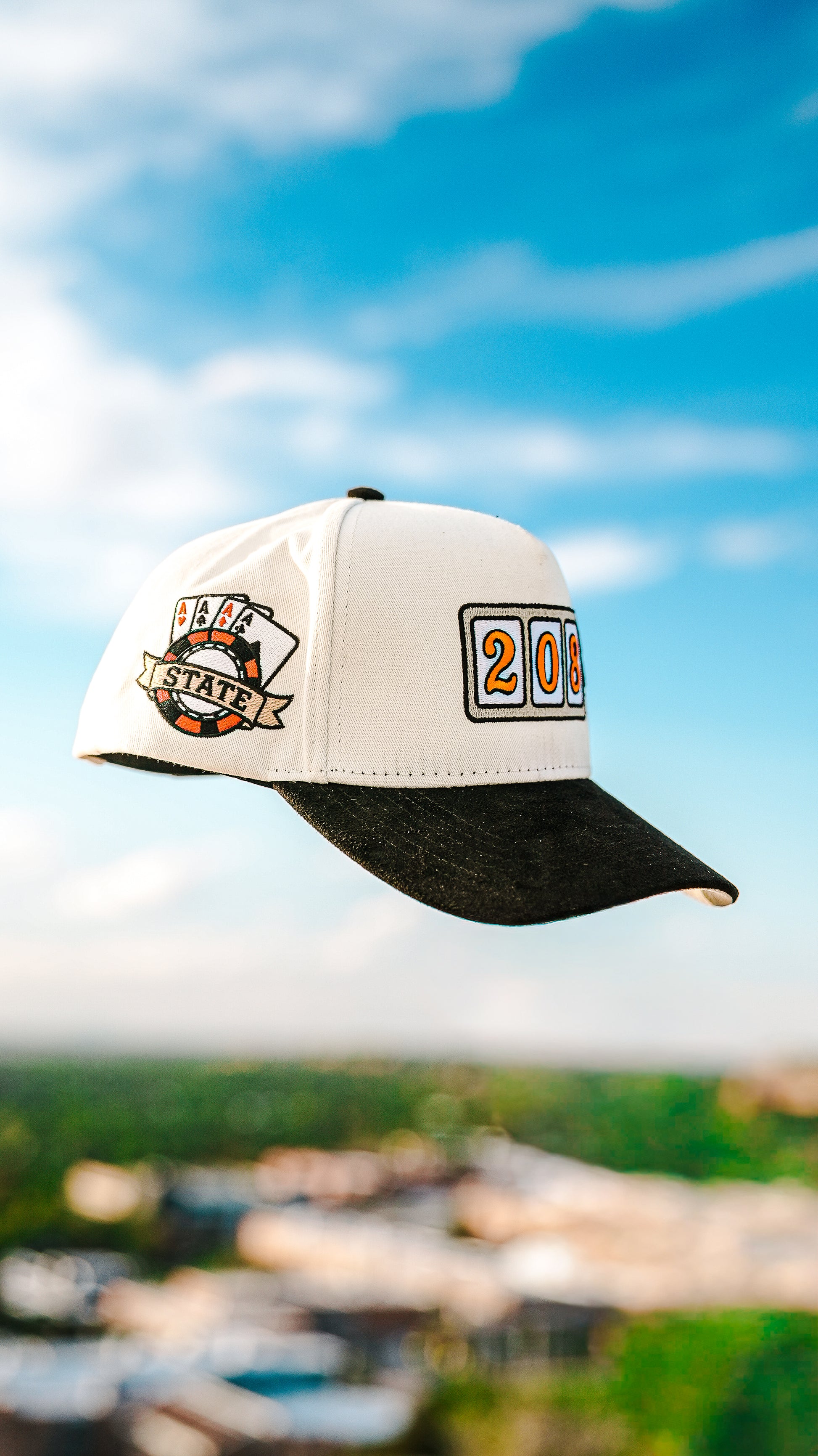 The 208 Casino snapback is a bold nod to Idaho style, featuring a striking slot machine inspired front patch. Built with a white cotton crown for comfort and a black suede brim for a premium finish, this hat is perfect for repping the 208 with a sharp look.