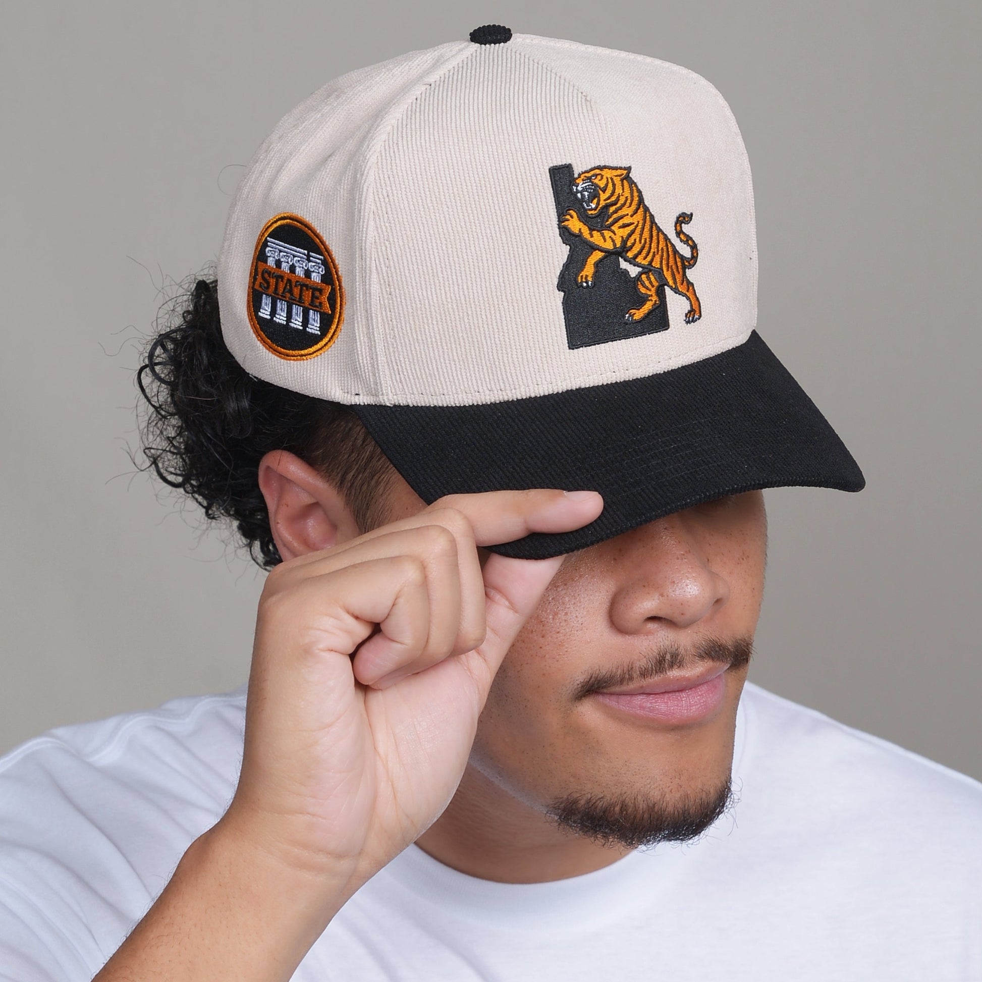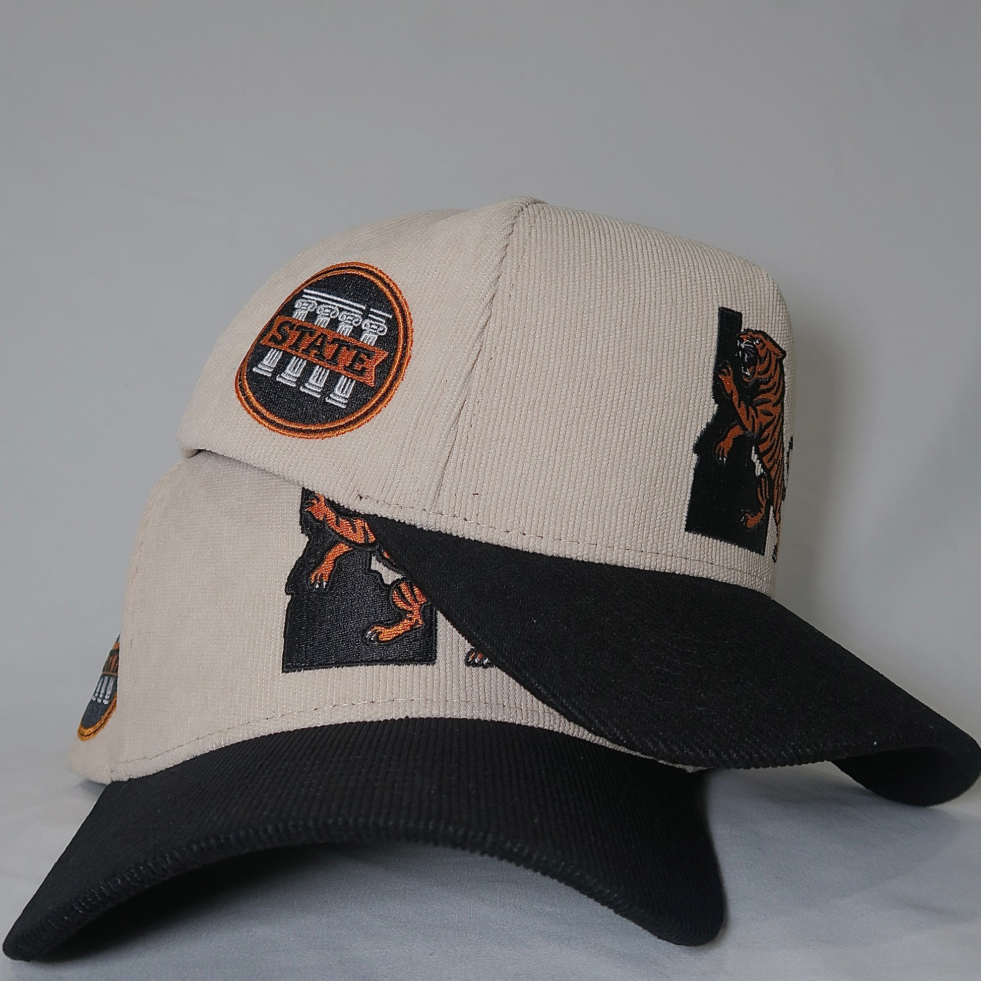 The OG State cap combines a vintage corduroy look with bold, detailed embroidery that speaks for itself. Featuring a roaring tiger wrapped around a rugged state silhouette and a classic pillars side patch, this piece brings heritage and attitude together in one clean design.