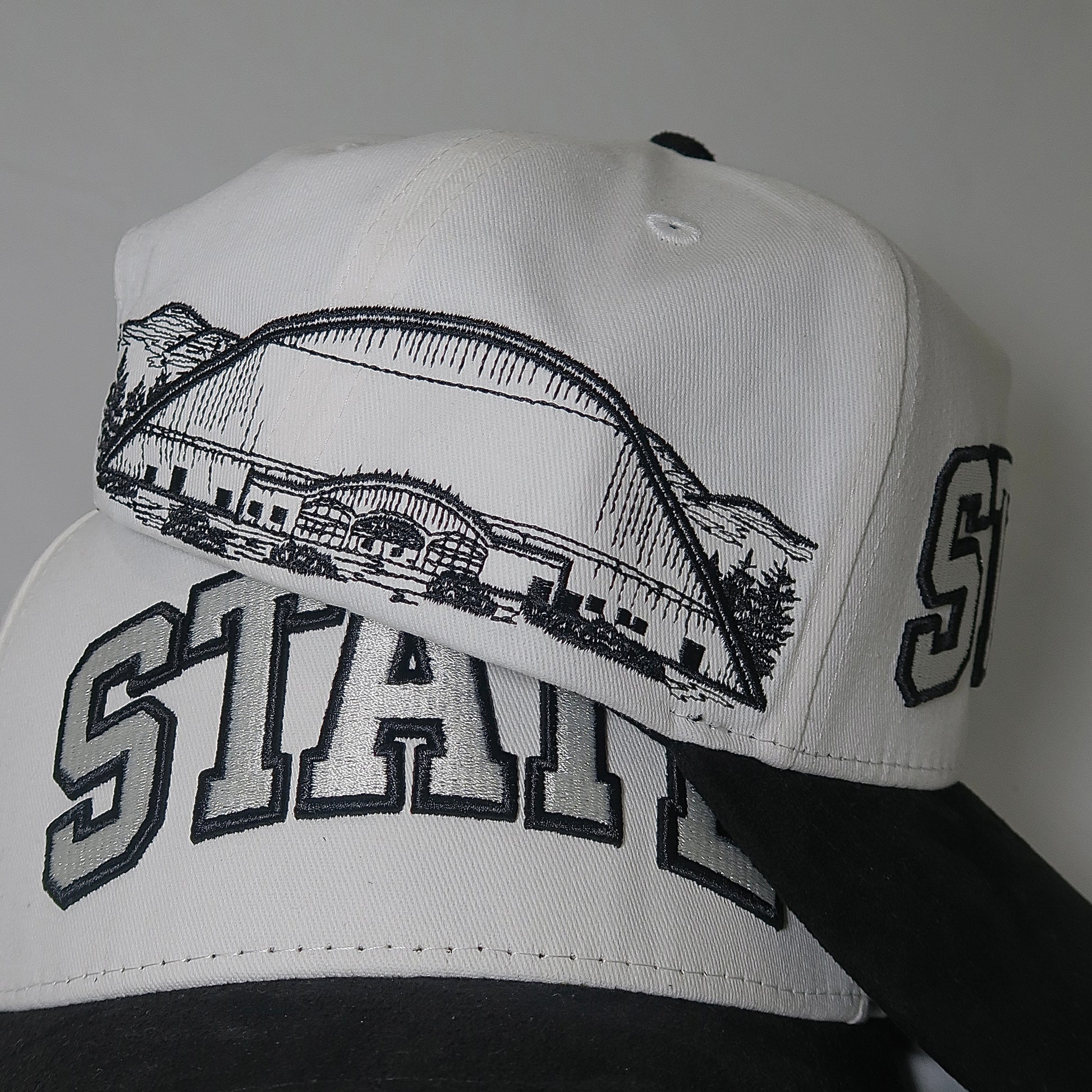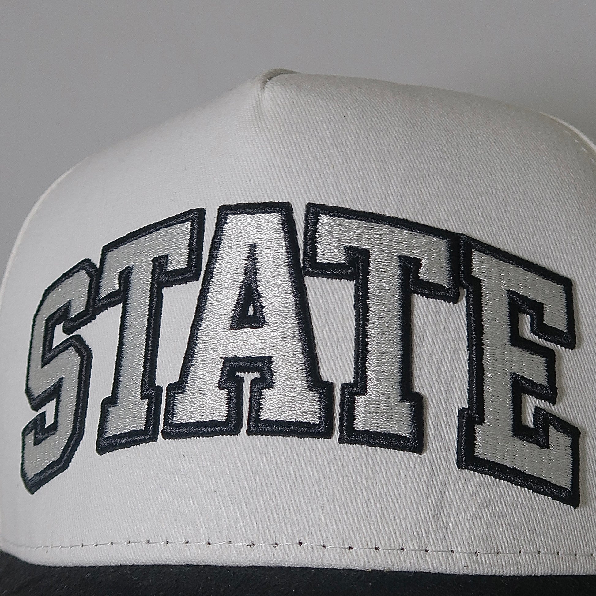 The Dome Cap brings a clean, modern look with a full white crown, bold STATE lettering, and a custom wraparound line-art sketch across the back. The black on white embroidery gives it a crisp, minimalist vibe, while the detailed dome artwork adds depth and character without being loud.